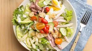 Fresh lettuce, grilled chicken, ham, boiled eggs, mushrooms, corn, tomatoes, shredded cheese, and toasted croutons, and herbs, creamy lemon dressing